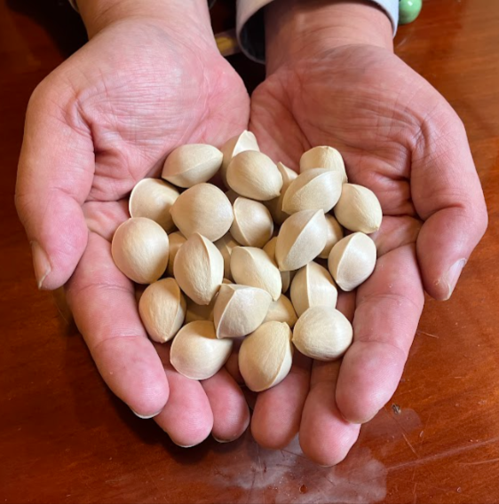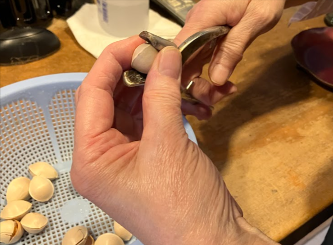 使うのは、60年連れ添う銀杏割り機。この道具がないと銀杏の身を綺麗に剥けないとか。小さな銀杏の中に詰まった香りと食感を、ひとつひとつ大切に引き出します。 -