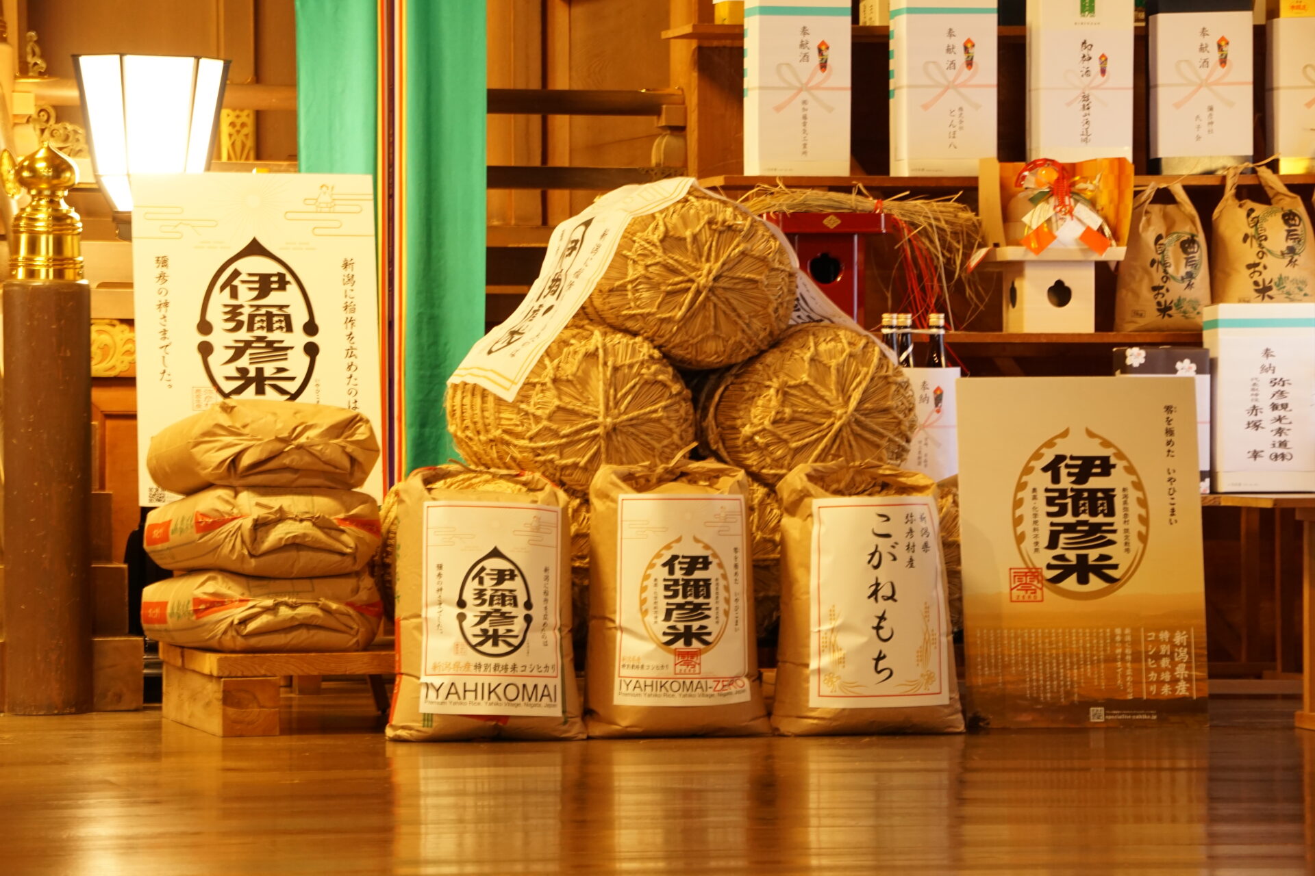 香り高く、やさしい甘みが広がる「伊彌彦米」、農薬・化学肥料を使わず100%有機肥料で育てた希少な「伊彌彦米零」、そして神前正月飾り「三光之飾」に用いられる弥彦村産「こがねもち」を奉納しました。